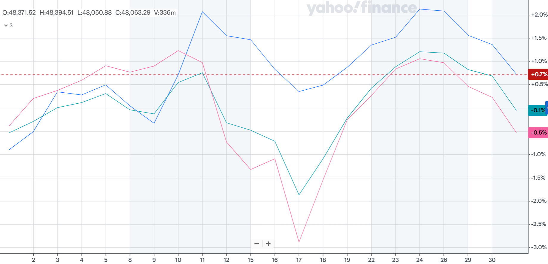 - ダウ平均:月初の始値47,580.85ドルから月末の終値48,063.29ドルへ上昇。月間の変動率は+1.02%。