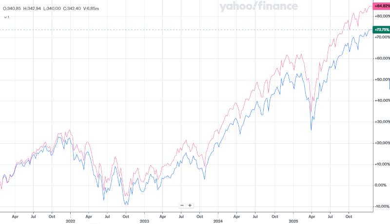 2020年のコロナ騒ぎによる株価暴落後から2025年までの五年間のVOOとVTIを比較すると、VOOのパフォーマンスがやや上回っています。
