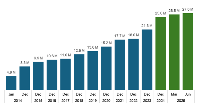 金融庁の利用状況調査で2025年以降の口座数データを確認します。2025年6月時点で2,700万口座ですが、そこから割合を推計しても二割弱。2027年末までに政府目標の3,400万口座は達成できるでしょうか。