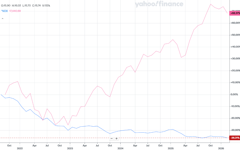 終値だけ見ても分かりにくいため、各ETFとインデックスとの比較をしてみます。設定から2026年2月までの推移を下記チャートに示します。